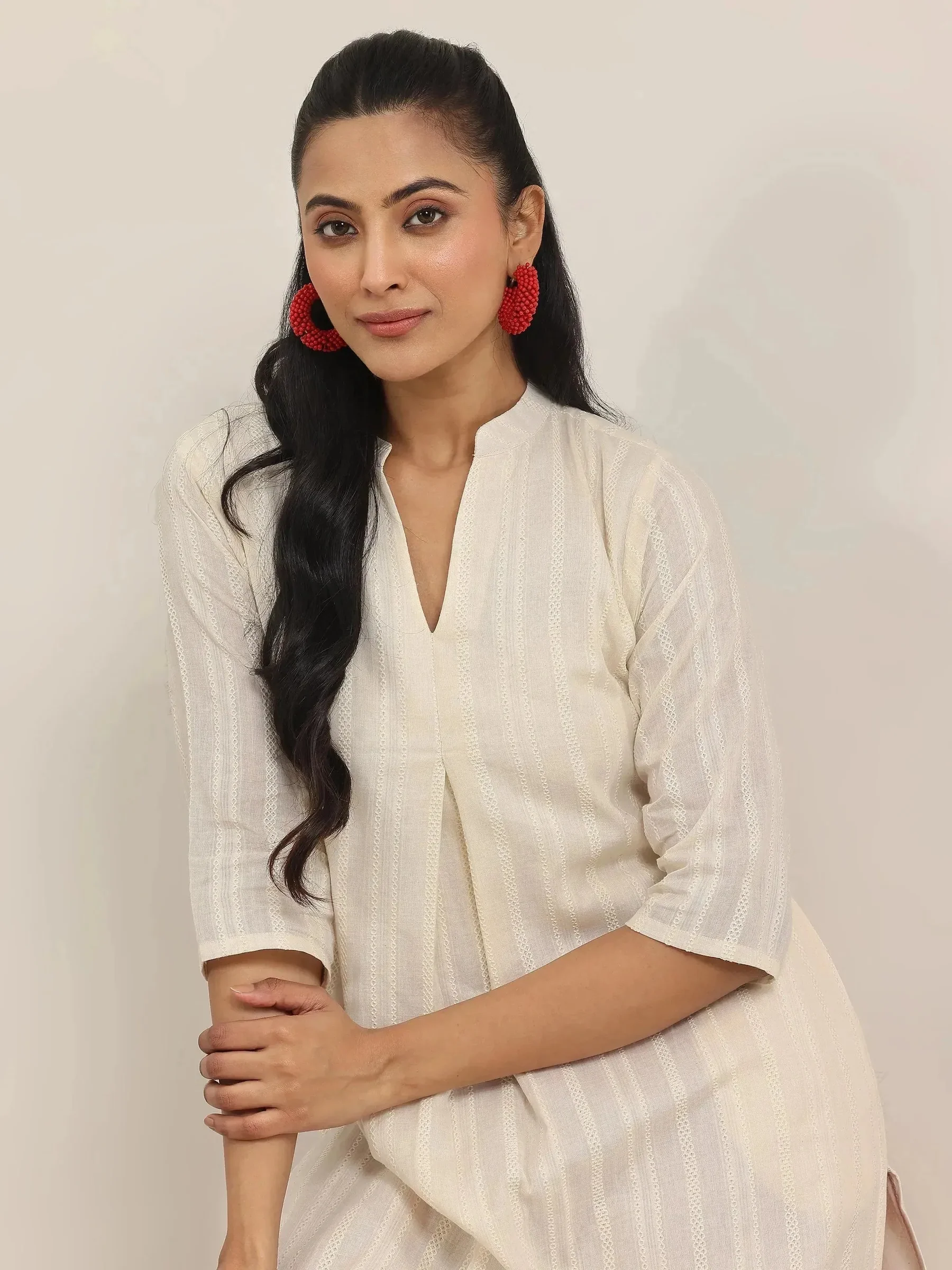 Off White Woven Design Cotton Straight Kurta